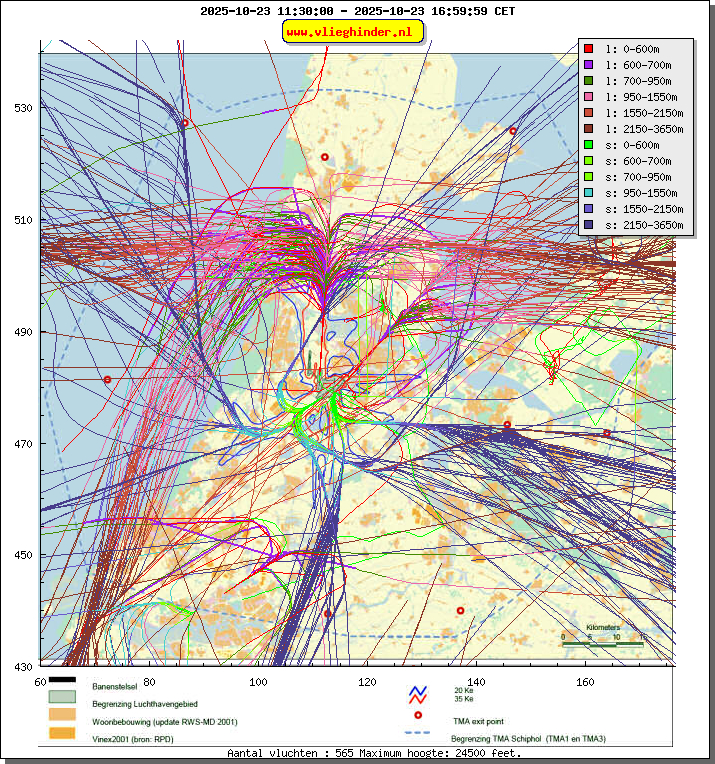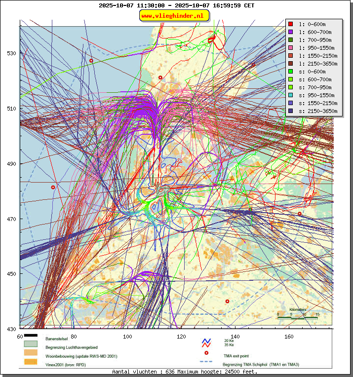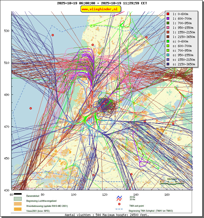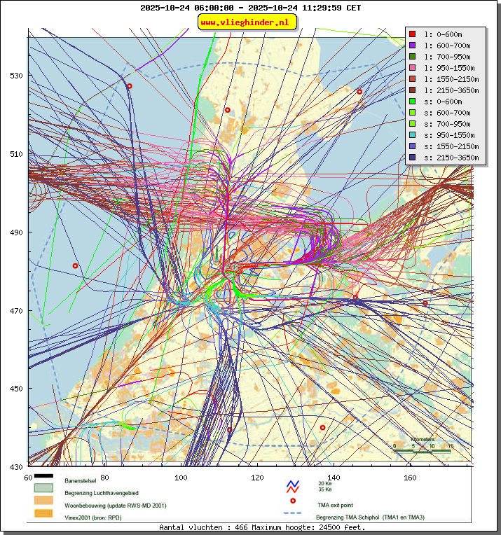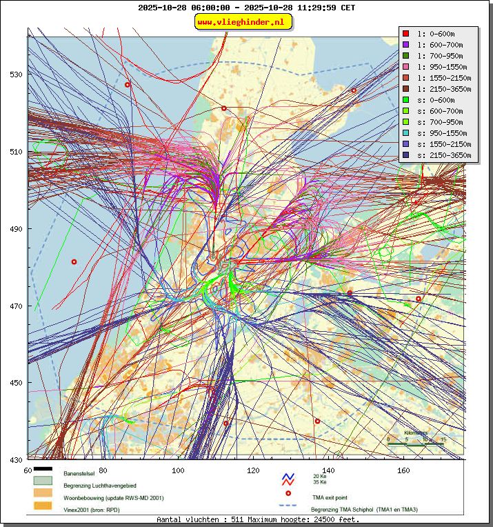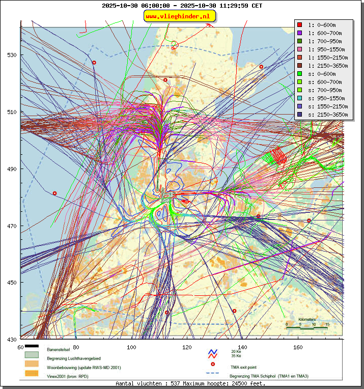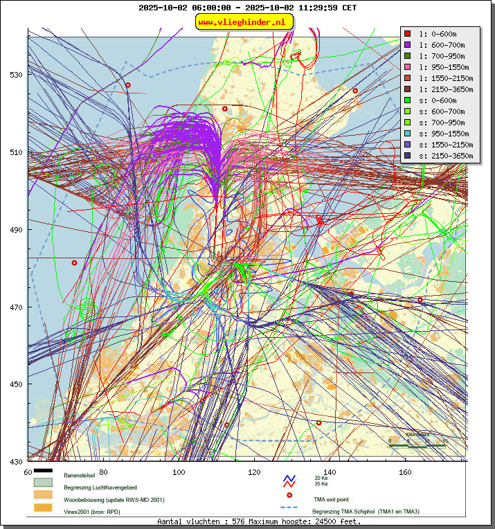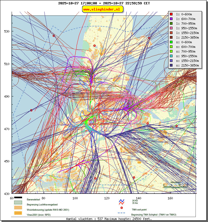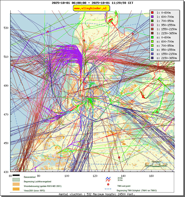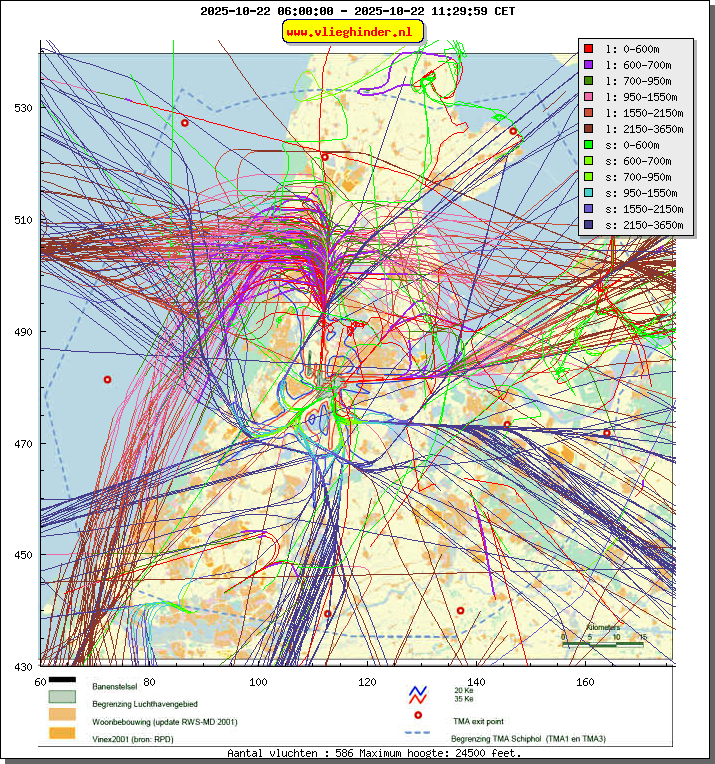 Landend verkeer wordt weergegeven in oranje.